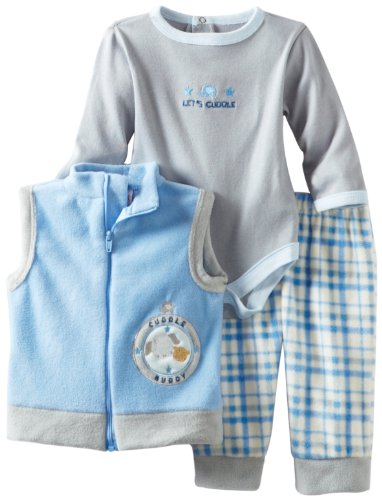 Polar fleece zip front vest with cuddle buddy embroidered applique. Also includes elastic waist polar fleece pant and cotton knit bodysuit with rear snap neck placket and 3-snap closure at inseam for easy on-off dressing.