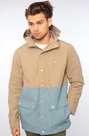 Fourstar Clothing The Anderson Signature Jacket in Putty. Model is wearing a size LargePuffy hooded two tone jacket with snap button and zipper closure; two front pockets with snap button closure; small metal logo tag at left chest; body 73% nylon, 27% cotton; lining 100% polyester; filler 100% polyester fibre.By Fourstar Clothing